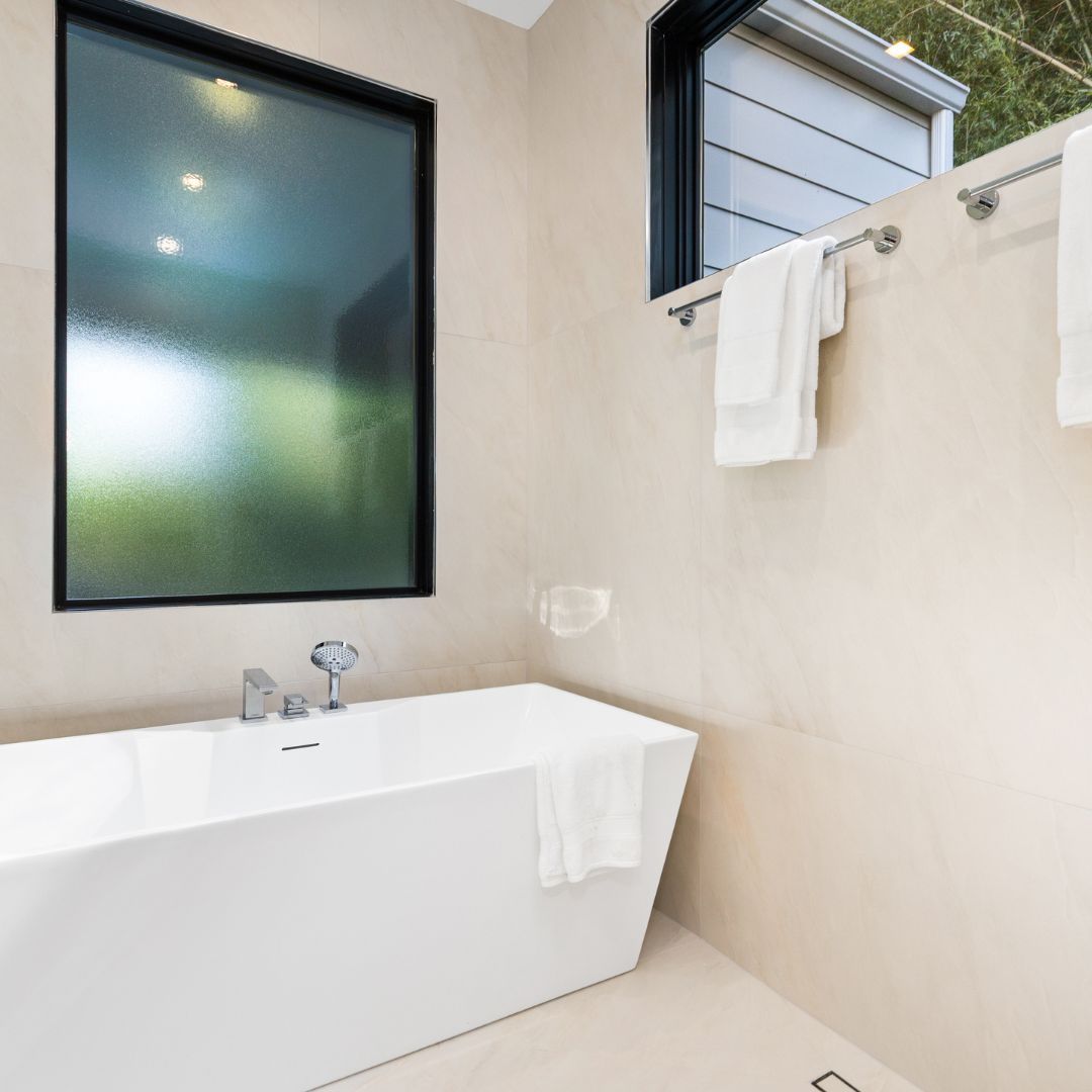 The primary suite serves as a true retreat, overlooking the tranquil pool through massive windows. We equipped the spa-like bathroom with heated floors, dual floating vanities, and a sophisticated curbless wet room for a seamless, modern feel. With six spacious bedrooms and nine bathrooms, every guest and family member enjoys absolute privacy and comfort within a layout designed for the modern lifestyle.