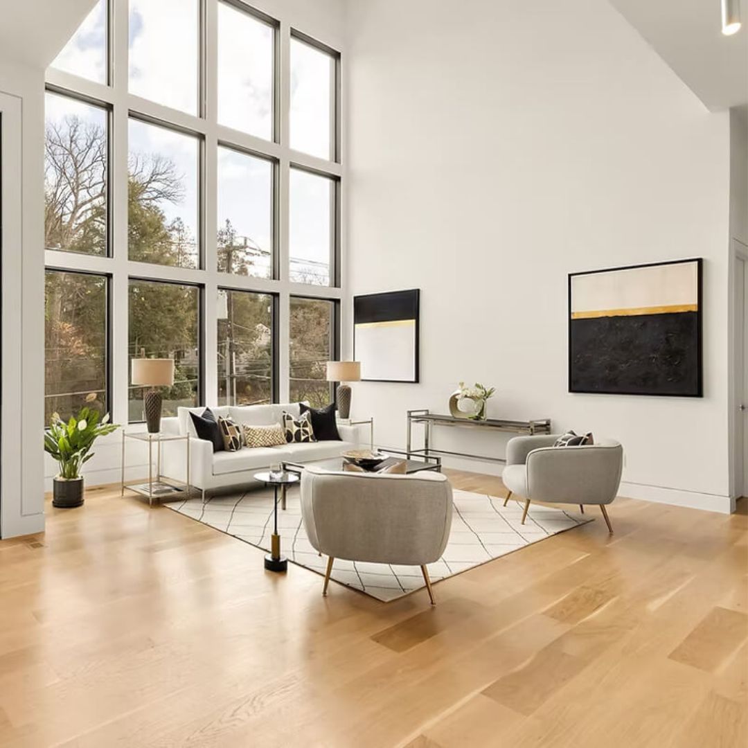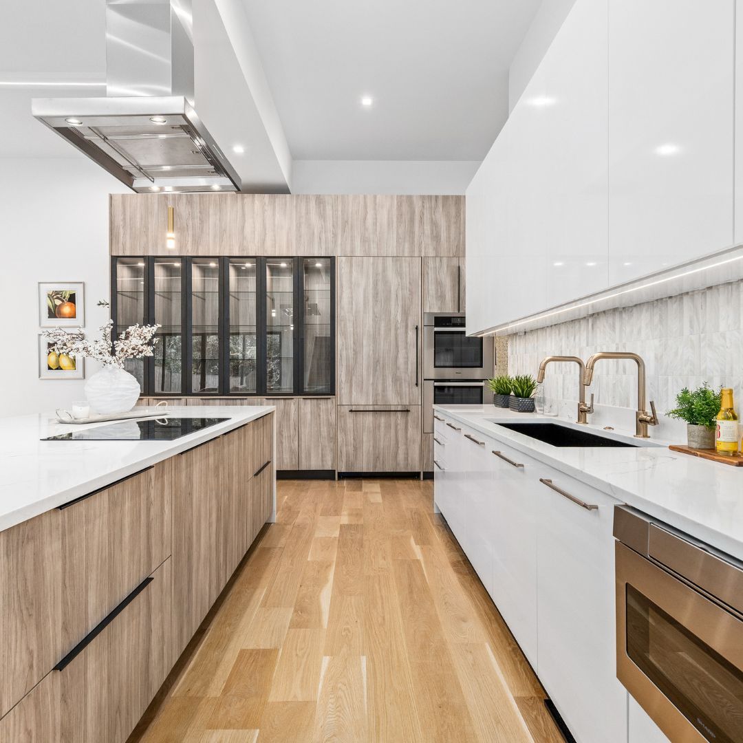 The heart of this home is a breathtaking 25-foot gallery living room, anchored by Marvin floor-to-ceiling glass that floods the space with natural light. We prioritized an open, airy aesthetic that maintains intimacy while celebrating grand proportions. European oak flooring and glass railings seamlessly connect the three levels, creating a cohesive flow throughout the expansive 7,101 square feet.